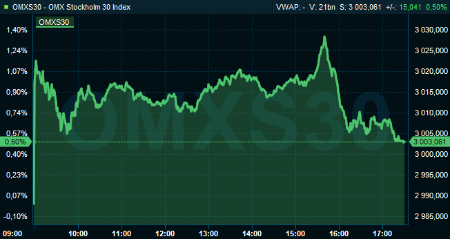STOCKHOLM (Nyhetsbyrån Direkt) Stockholmsbörsen steg på torsdagen. Stöd kom från en överenskommelse om Grönland och ett tillbakadragande av tullhotet i Europa. Vid börsens stängning hade OMXS30 stigit 0,5 procent till 3.003. Aktier för 30 miljarder kronor hade då omsatts på Stockholmsbörsen. I dagens rapportskörd avancerade EQT med 4 procent. Riskkapitalbolagets siffror för det andra halvåret låg över förväntan på alla områden. Ebitda-resultatet landade på 836 miljoner euro, att jämföra med konsensus på 763 miljoner euro. EQT meddelade även ett förvärv av Coller Capital till en köpeskilling om 3,2 miljarder dollar. Essity föll med 7 procent efter en rapport som visade på en starkare marginal och resultat än analytikernas estimat, men en lägre omsättning. Teleoperatörerna gick framåt med uppgångar på runt 2 procent vardera för Tele2 och Telia. I sektorn avancerade Telenor på Oslobörsen efter försäljningen av thailändska True för 39 miljarder norska kronor. Försäljningen kan enligt Citi vara positivt även för de båda nämnda svenska bolagen eftersom Telenor nu har större finansiell kapacitet för potentiella fusioner och förvärv inom Norden. Investmentbolaget Investors justerade substansvärde uppgick till 355 kronor per aktie i slutet av 2025. Bolaget föreslår en utdelning om 5:60 (5:20) kronor per aktie för 2025. Aktien steg cirka en halv procent till 339:50 kronor. I försvarssektorn sjönk Saab 4 procent. Donald Trump uppgav att hans budskap till Rysslands president Vladimir Putin var att kriget i Ukraina måste få ett slut. Uttalandet kom efter vad Donald Trump beskrev som "goda" samtal med Ukrainas president Volodymyr Zelenskyj i Davos. Byggbolaget NCC meddelade preliminära siffror för det fjärde kvartalet. Rörelseresultatet var 692 miljoner kronor (844), exklusive jämförelsestörande poster. Aktien höjdes 3 procent. Belysningsföretaget Plejd stärktes 15 procent efter sin rapport för det fjärde kvartalet som visade på en försäljningstillväxt om drygt 41 procent och en rörelsemarginal som ökade till 27,8 procent. Lundin Mining släppte en produktionsprognos för 2026. Guidningen är en kopparproduktion om 310.000-335.000 ton, och en guldproduktion på 134.000-149.000 uns. Aktien tappade 11 procent. Xvivo steg 7 procent. Enligt bolagets vd skulle ett USA-godkännande för sektorkollegan Bridge to Life eventuellt snabba upp vägen till marknaden för Xvivo inom området för lungperfusion vid transplantationer. Graf: OMXS30 torsdagen den 22 januari 2026 Källa: Infront
